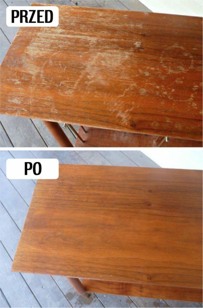 Wymieszanie połowy szklanki octu z połową szklanki oliwy z oliwek, zanurzenie w tym szmatki oraz dokładne przetarcie drewna. Sprawi to, że pozbędziesz się wszelkich plam oraz zadrapań, a twój stół będzie wyglądał jak nowy.