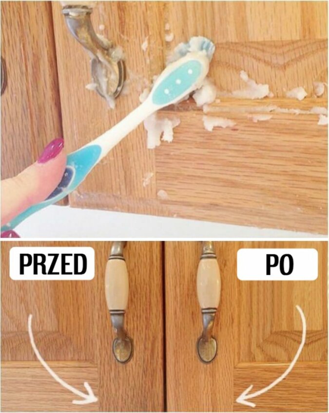 Wymieszanie 1 łyżki oleju roślinnego z 2 łyżkami proszku do pieczenia oraz wyszorowanie szafki używając szczoteczki bądź szmaty.