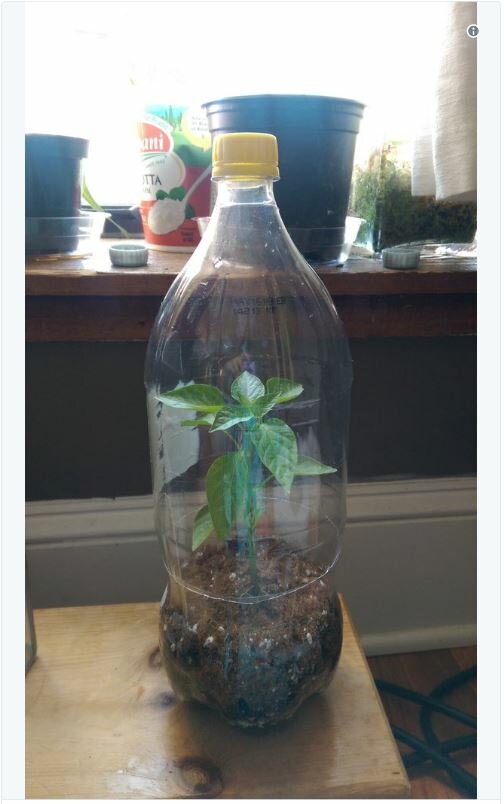5) Uważasz, ze aktualnie panująca zbyt niska temperatura może stanowić zagrożenie dla Twoich roślinek? Zabezpiecz je wykorzystując do tego celu plastikową butelkę. Roślinę wstaw do rozciętej na pół butelki i przykryj górną częścią.